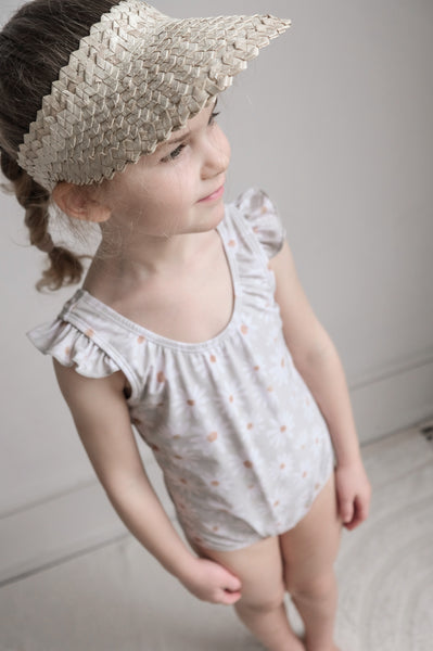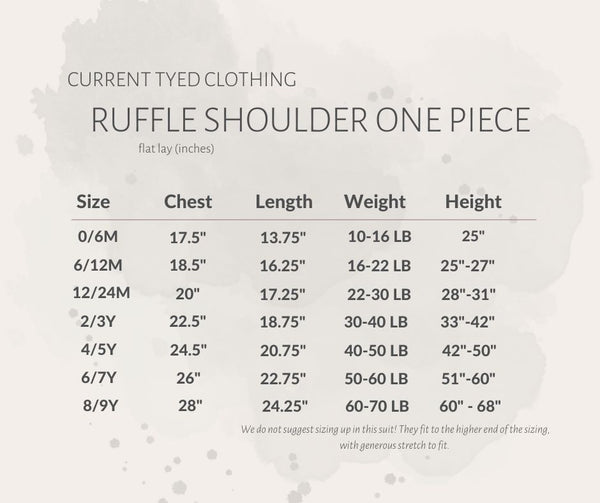 Our Ruffle Shoulder One Piece Suits offer full Chemical Free UPF 50+ Protection in the sweetest design around. These suits are fully lined and the shell of the suit is made from our ultra soft + breathable Lycra fabric providing 4-way stretch for all day comfort and play. Our suit features a scoop neck and back, along with beautiful shoulder ruffle for additional sun coverage. The sweetest touch for your sweetest little ones. Our bottoms are a full cut and fully cover. Diaper snaps included on sizes up to 12/24M!