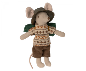 This mouse is well-prepared for a hiking trip in the wild nature. He is dressed for days of walking and brings her sleeping bag for nights under the stars. He has magnets in her hands. Add more accessories from the hiker collection for more play.