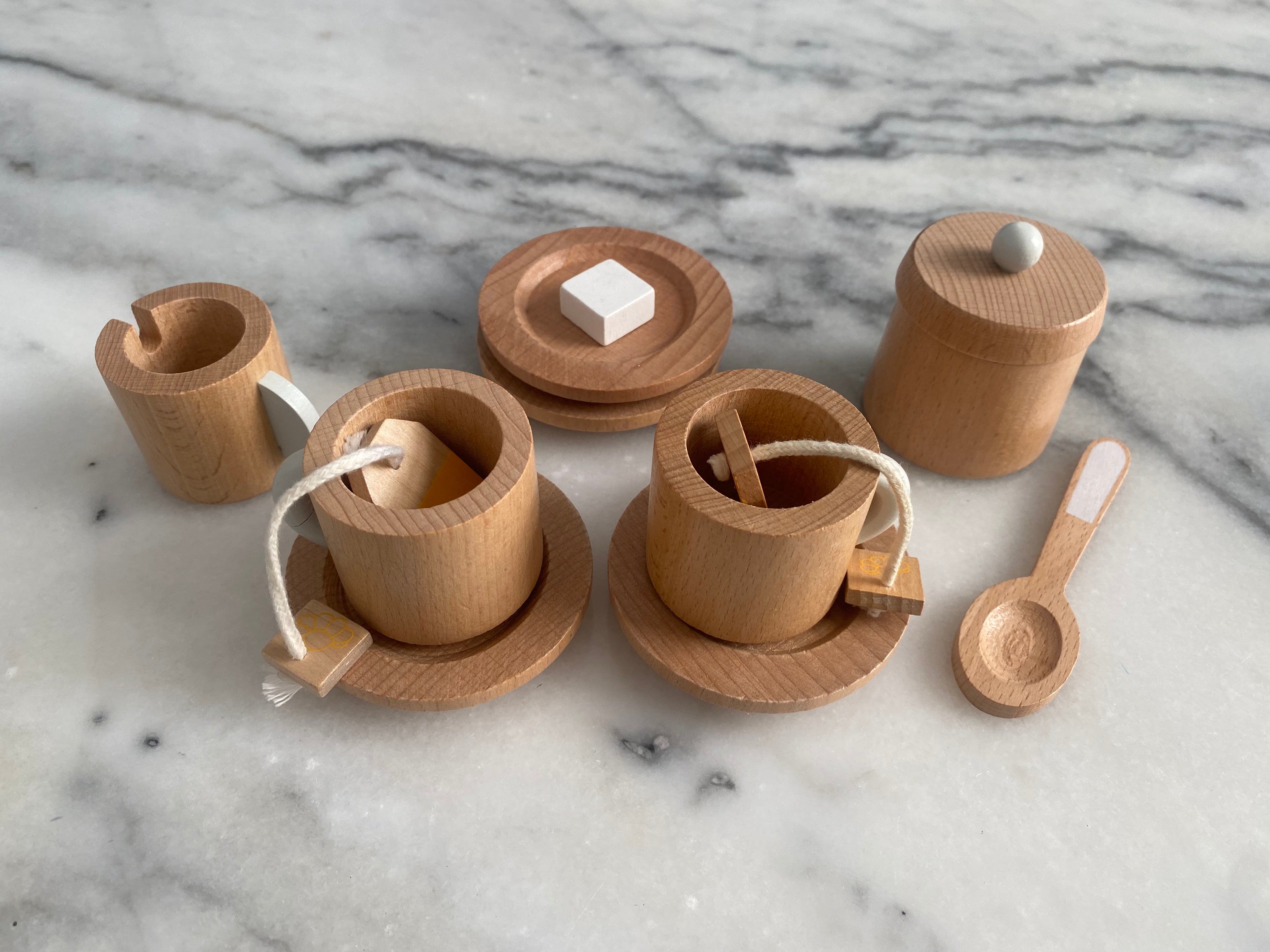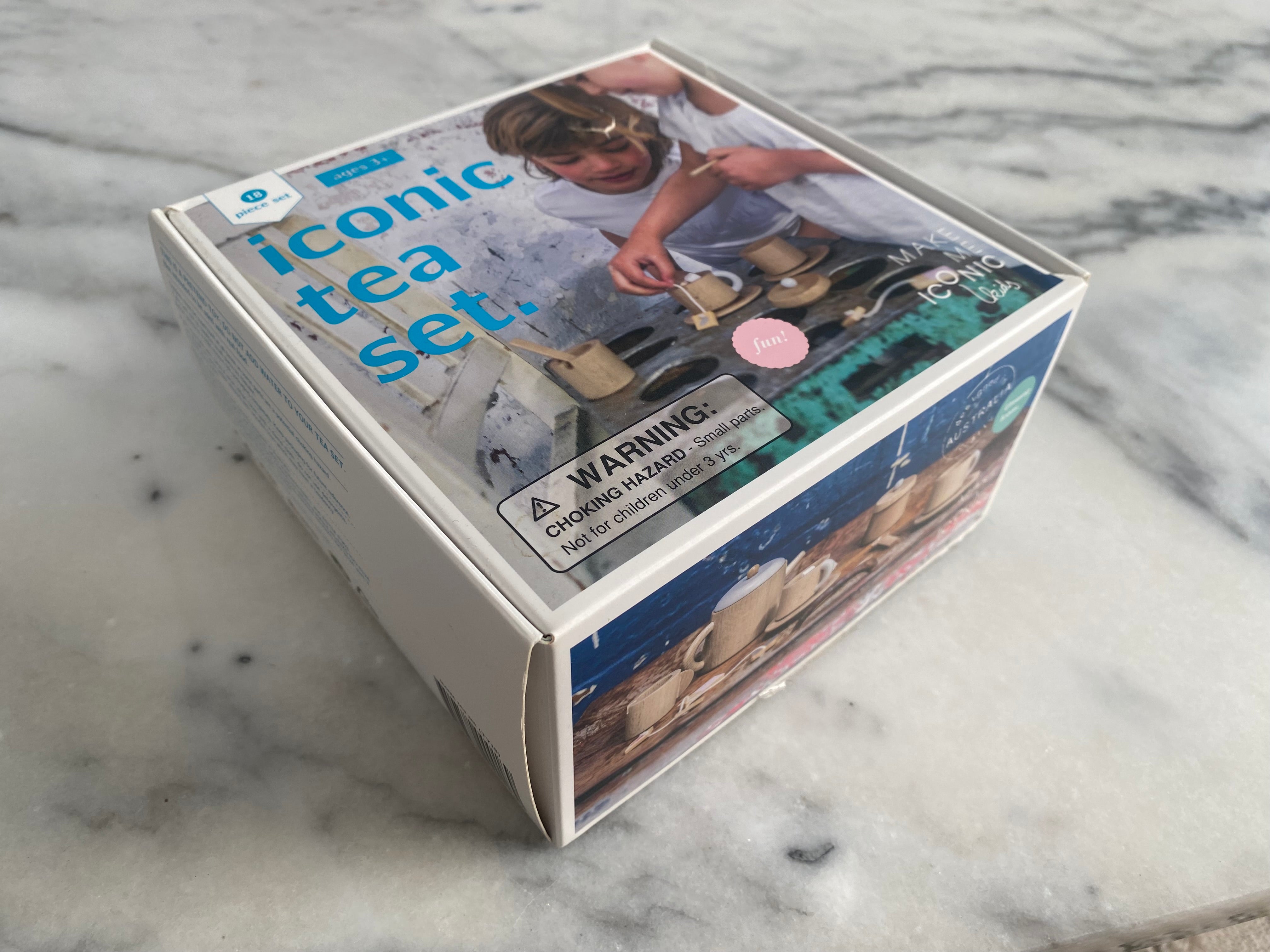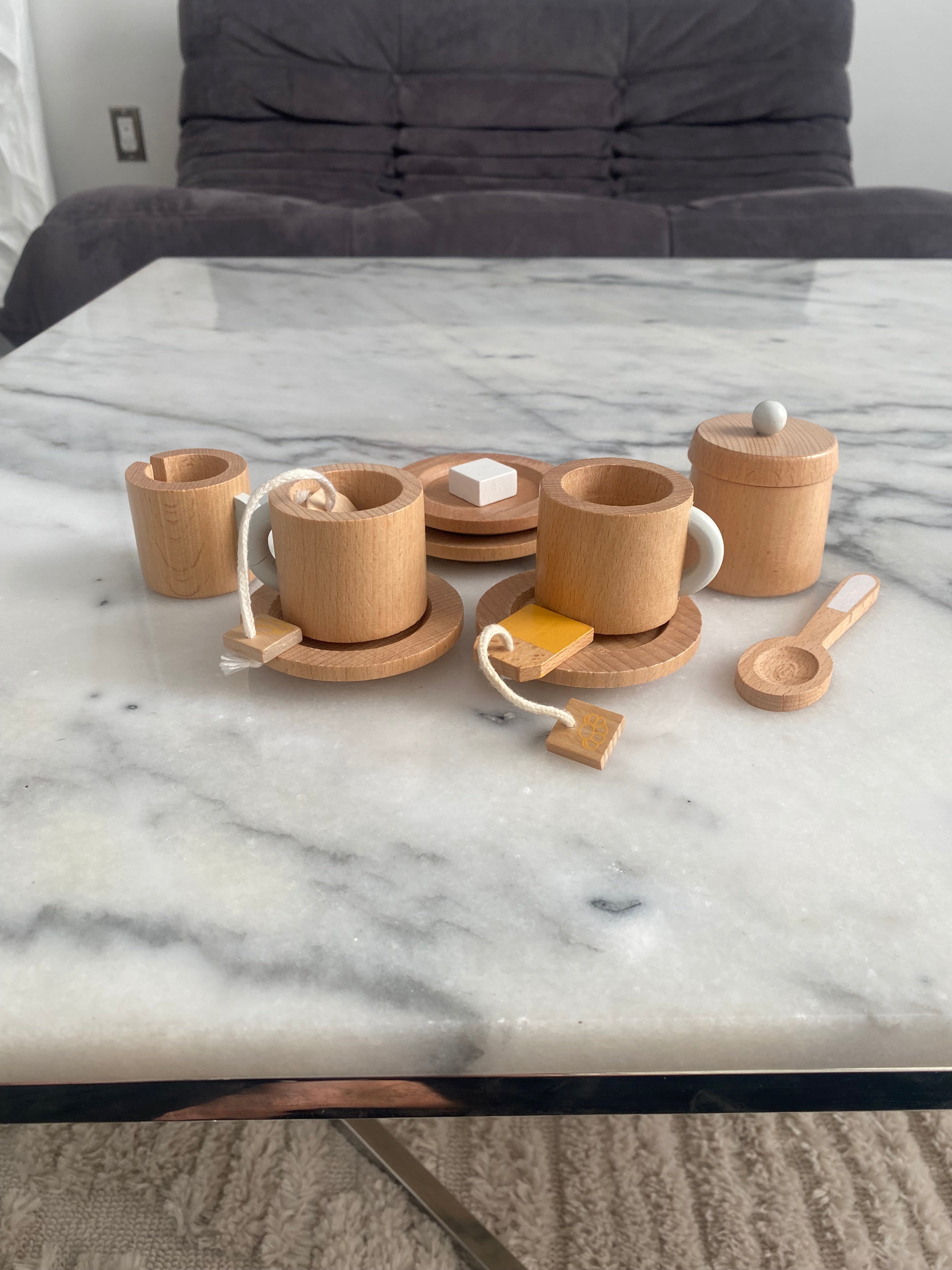 This is a new Make me Iconic Wooden Tea Set. It is missing a tea pot. Box has minimal damage.