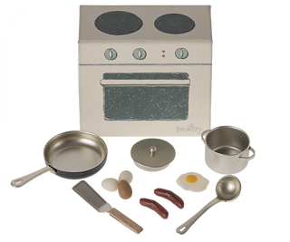 A small kitchen set for any mouse. This set include kitchen utensils, eggs and sausages to make the perfect brunch. It is packed in a paper box decorated as a small kitchen so it becomes a part of the play and storytelling.